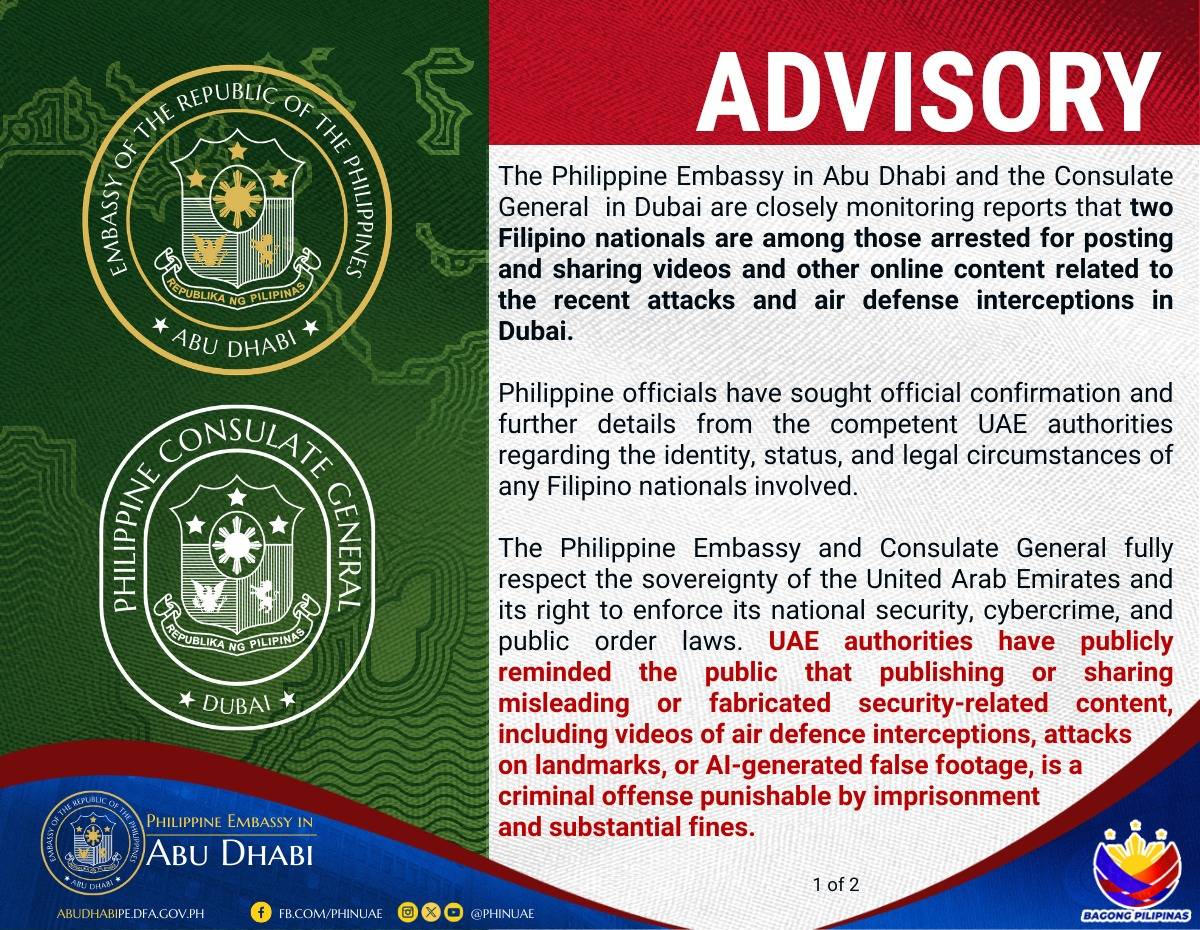 The Philippine Embassy in Abu Dhabi and the Consulate General in Dubai are closely watching reports regarding Filipino nationals. Authorities reportedly arrested these individuals for posting and sharing videos related to recent attacks and air defense interceptions in Dubai.